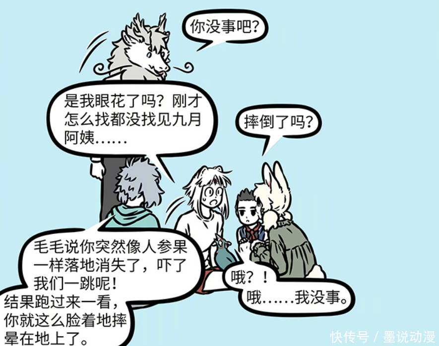 敖烈关心九月,问她有没有事情。阿毛觉得自己眼花了,刚才怎么找都没有找到九月阿姨。至于哪吒和小玉,则是问了九月是不是摔倒了。哮天复述了下刚才的情况,阿毛说九月就像人参果一样,落地就消失,这还吓了他们一跳。正因为如此,敖烈、哮天、哪吒、阿毛和小玉才会赶过来。