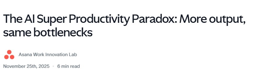 Asana旗下的Work Innovation Lab将这个现象称为“AI时代的超级生产力悖论”:个体的生产速率极速拉满,但组织消化和审批的“吸收速率”却依然停滞。他们在一篇《AI超级生产力悖论:更多的产出、相同的瓶颈》的文章分享了自己基于9000多名劳动者的调研结果:个体员工加快了产出,但组织系统保持不变——只有五分之一的组织在为AI重新设计工作流。