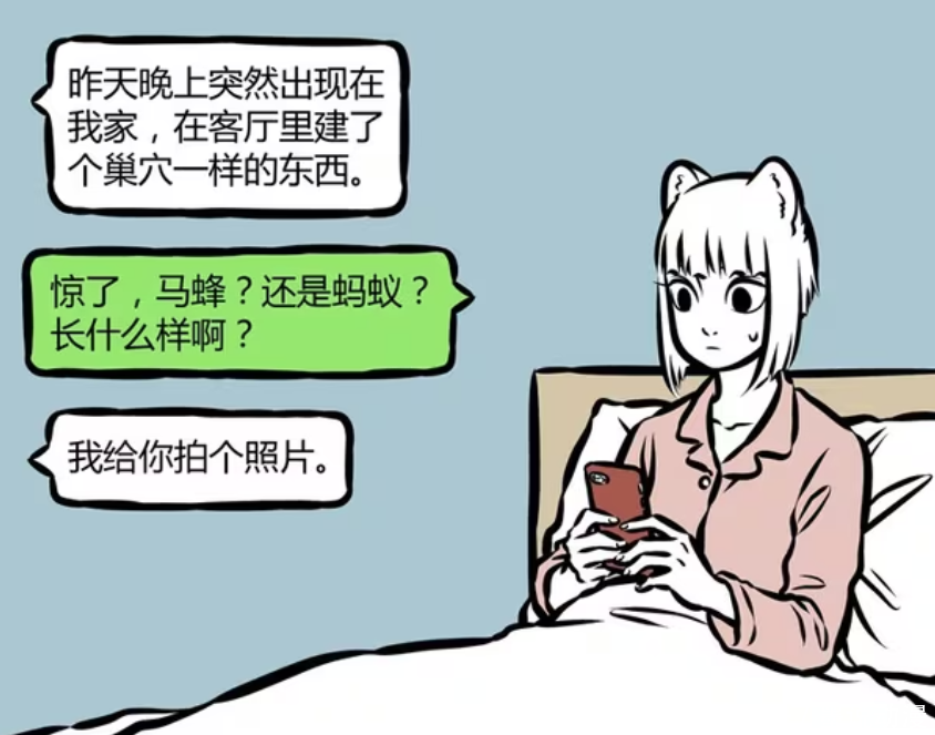 敖烈告诉九月,他家昨天晚上突然出现了这个生物,在客厅里面建了个类似巢穴的东西。九月有点吃惊,那么敖烈家到底是被马蜂入侵,还是被蚂蚁筑巢?其实都不是,敖烈也解释不清楚,所以要给九月拍个照片。