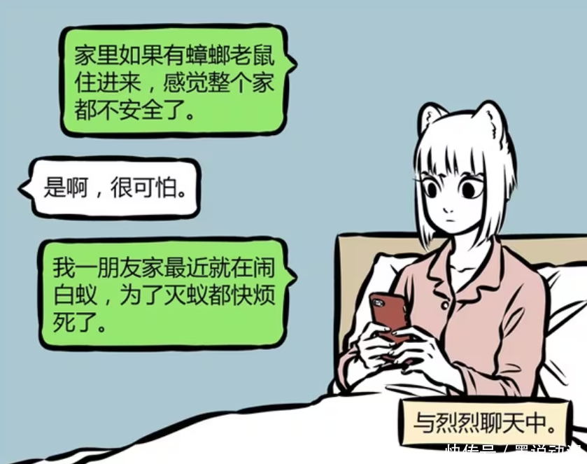 九月和敖烈关系很好,平时睡觉之前都还会聊天。九月觉得家里如果有老鼠和蟑螂住进来,感觉家里就变得不安全。敖烈表示赞同,毕竟他也不喜欢其他生物出现。不过如果只是老鼠,那有可能成为九月的口粮。九月还告诉敖烈,她有个朋友家里最近闹白蚁,灭蚁成了头疼的事情。