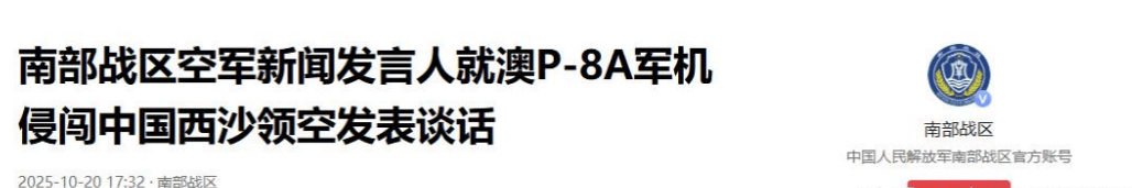 2025年10月19日,澳大利亚的P-8A军机未经中国政府批准,擅自进入了西沙领空。对此,中国南部战区迅速做出了反应,组织海空力量跟踪监视,并依法实施警告与驱离。这已不是第一次澳大利亚挑战中国的底线,自2022年起,澳大利亚的P-8A就多次在南海进行所谓“侦察”行动,均遭到中国军方的严厉反制。显然,这不仅是一场空中的交锋,更是双方在地缘政治上的较量。